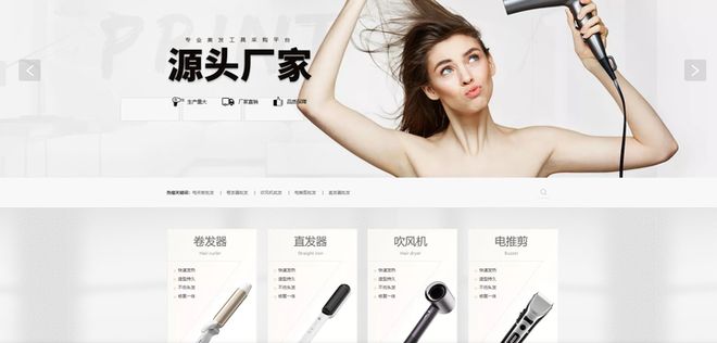 这款模板采用了金色和黑色的配色,显得奢华。首页展示了各种美发工具的图片和介绍,还有详细的购买指南和服务承诺。整体设计专业,适合用来展示你的产品质量和技术实力。